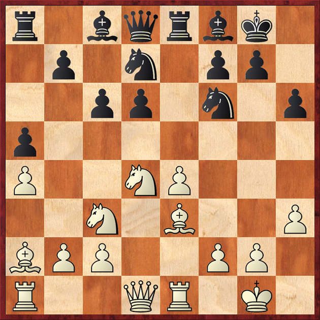 1.d4 g6 2.Nf3 Bg7 3.c4 Nf6 4.Nc3 d5 5.cxd5 Nxd5 6.e4 Nxc3 7.bxc3 c5 8.Be3 Qa5 9.Qd2 0–0 10.Rc1 e6 11.Bd3 b6 12.Bh6 Nc6 13.Bxg7 Kxg7