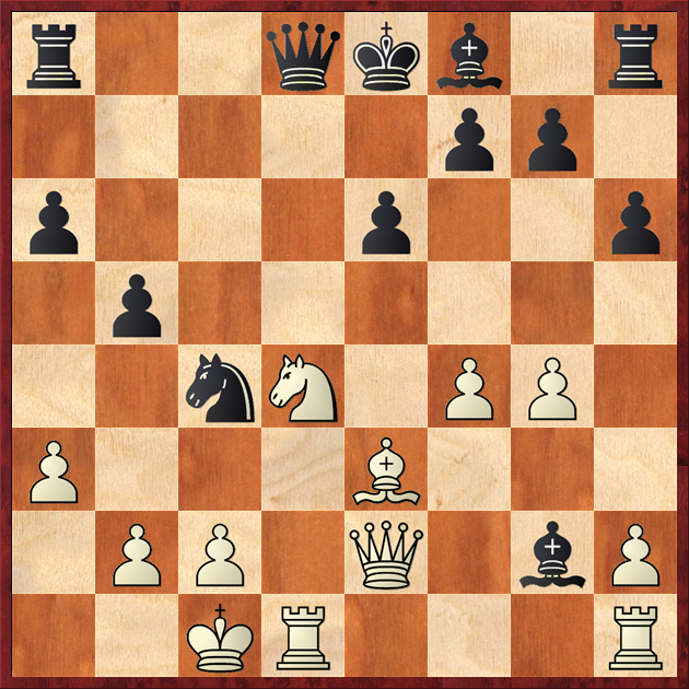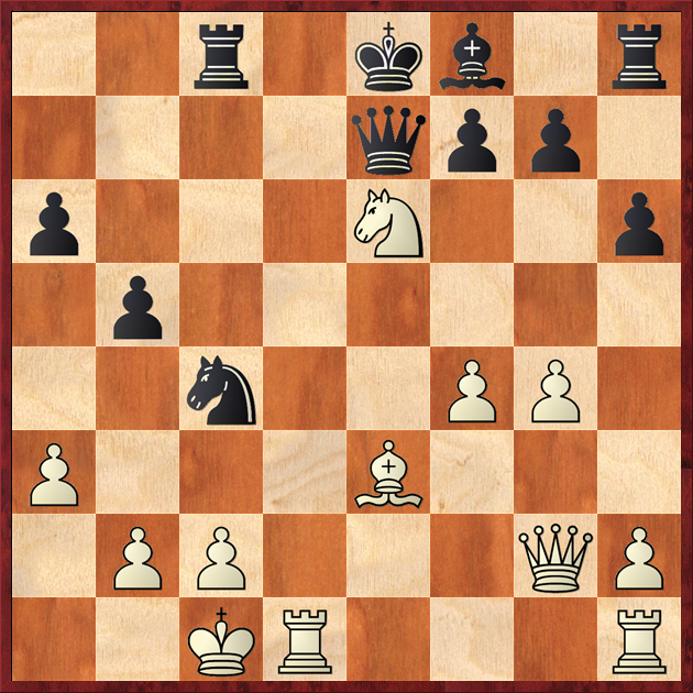In positions with a centralized king each mistake may prove fatal. White achieves the advantage after 16...Nxe3 17.Qxe3 Bc5 (17...Bxg2? 18.Nxe6 fxe6 19.Rxd8+ Rxd8 20.Qxe6+ Be7 21.Re1 Rd7 22.Qg6+ Kf8 23.Qxa6) 18.Qc3 Bxd4 19.Rxd4 0–0 20.Bxd5 exd5 21.Rhd1.
